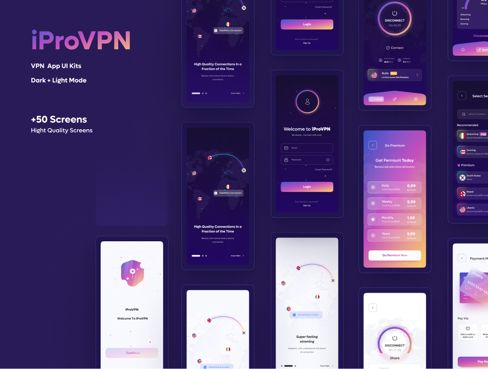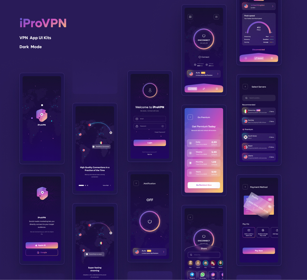 VPNite is a user interface kit for VPN mobile apps. It offers a user interface that is current, sleek, and thorough. Because of vector shapes and well-organized layers, concepts are simple to alter, customise, and resize.